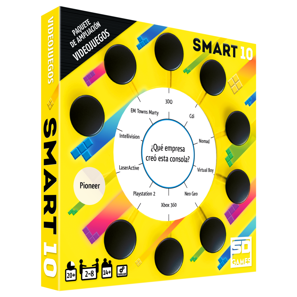 Un nuevo conjunto de tarjetas de preguntas para el juego SMART10! Este paquete incluye 50 tarjetas de doble cara, con 100 nuevas preguntas y un total de 1000 respuestas relacionadas con el apasionante mundo de los videojuegos. En Smart10 Videojuegos pondrás a prueba tus conocimientos sobre juegos digitales, desde los clásicos retro hasta las últimas novedades, pasando por compañías desarrolladoras, personajes icónicos y mucho más. Puedes reemplazar las tarjetas originales de preguntas en la caja SMART con dos paquetes de ampliación temáticos o bien mezclar estas preguntas de videojuegos con la mitad del set original. Para jugar, es necesario contar con la caja SMART incluida en el juego base de Smart10.